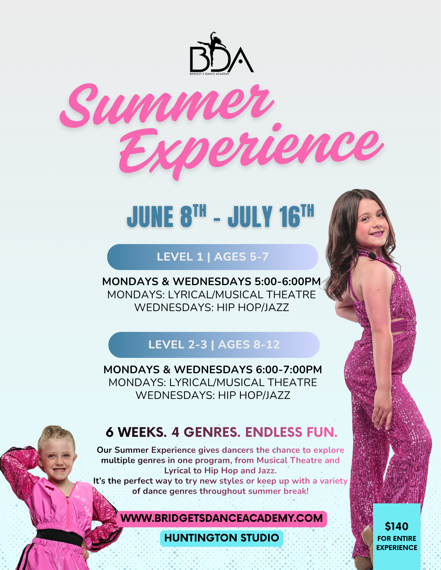 Our Summer Experience gives dancers the chance to explore multiple genres in one program, from Musical Theatre and Lyrical to Hip Hop and Jazz. It’s the perfect way to try new styles or keep up with a variety of dance genres throughout summer break!
